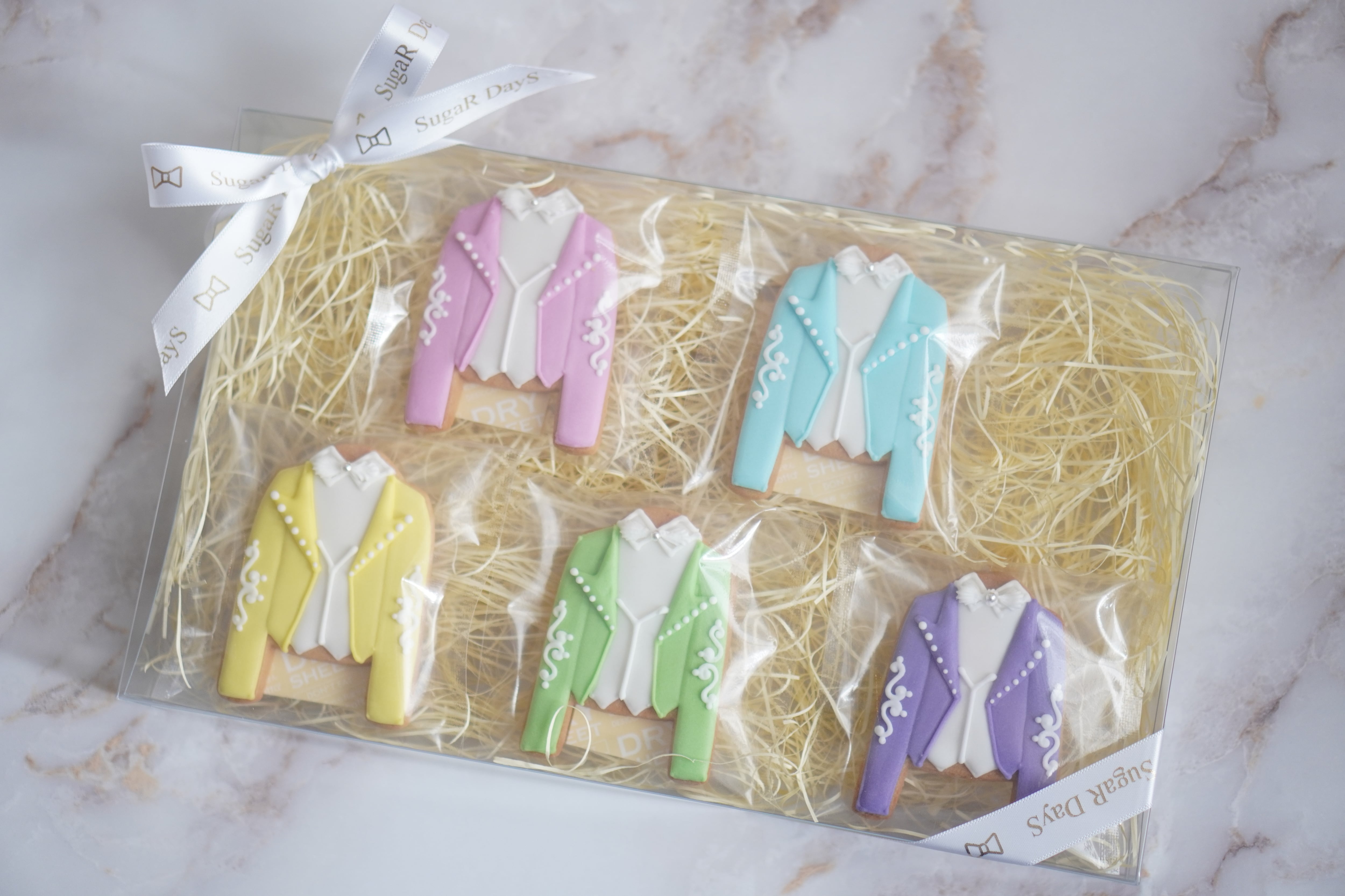 スーツ型(燕尾服)のアイシングクッキー。基本はピンク、黄、緑、青、紫の5枚セットです。